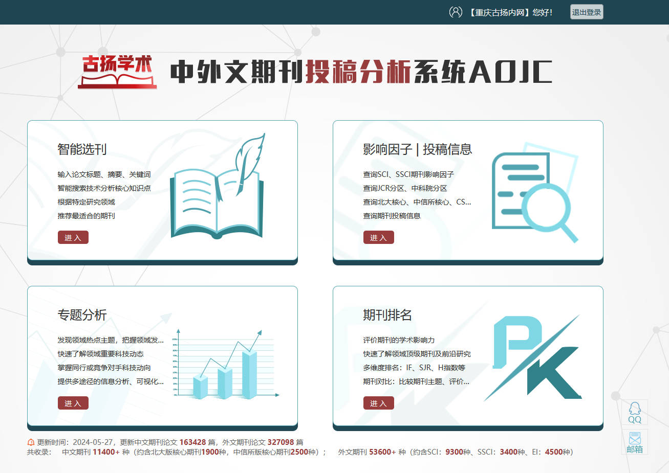 首页分为四个模块,有:智能选刊、影响因子,投稿信息、专题分析和期刊排名;