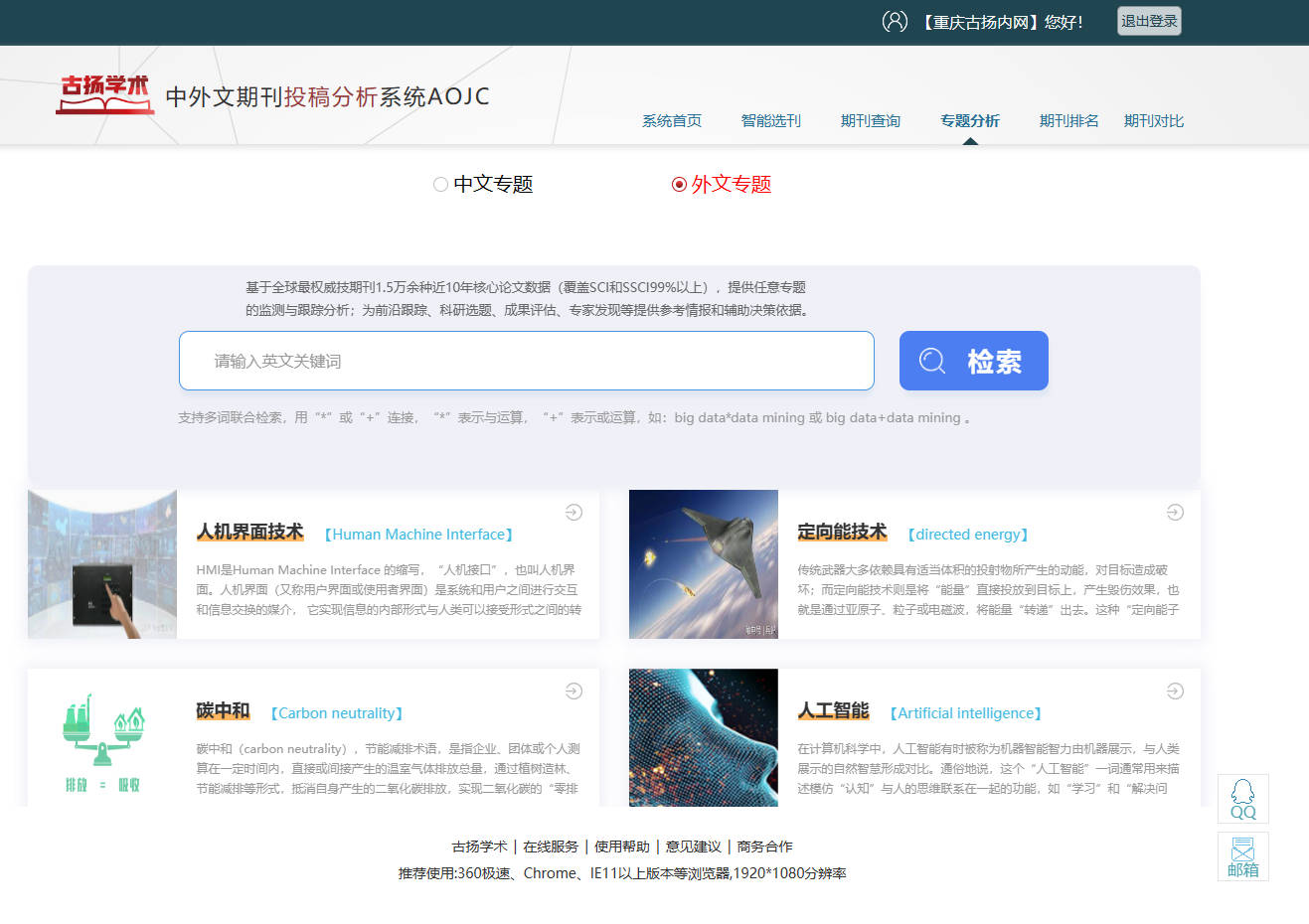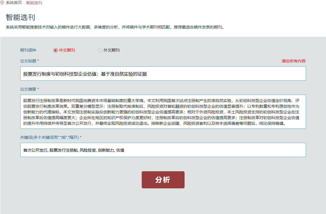 系统采用智能搜索技术对输入的稿件进行大数据、多维度的分析,并将稿件与学术期刊相匹配,推荐最适合稿件发表的期刊,