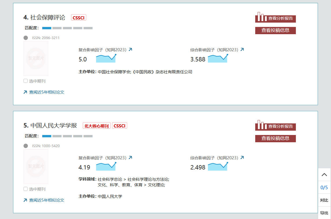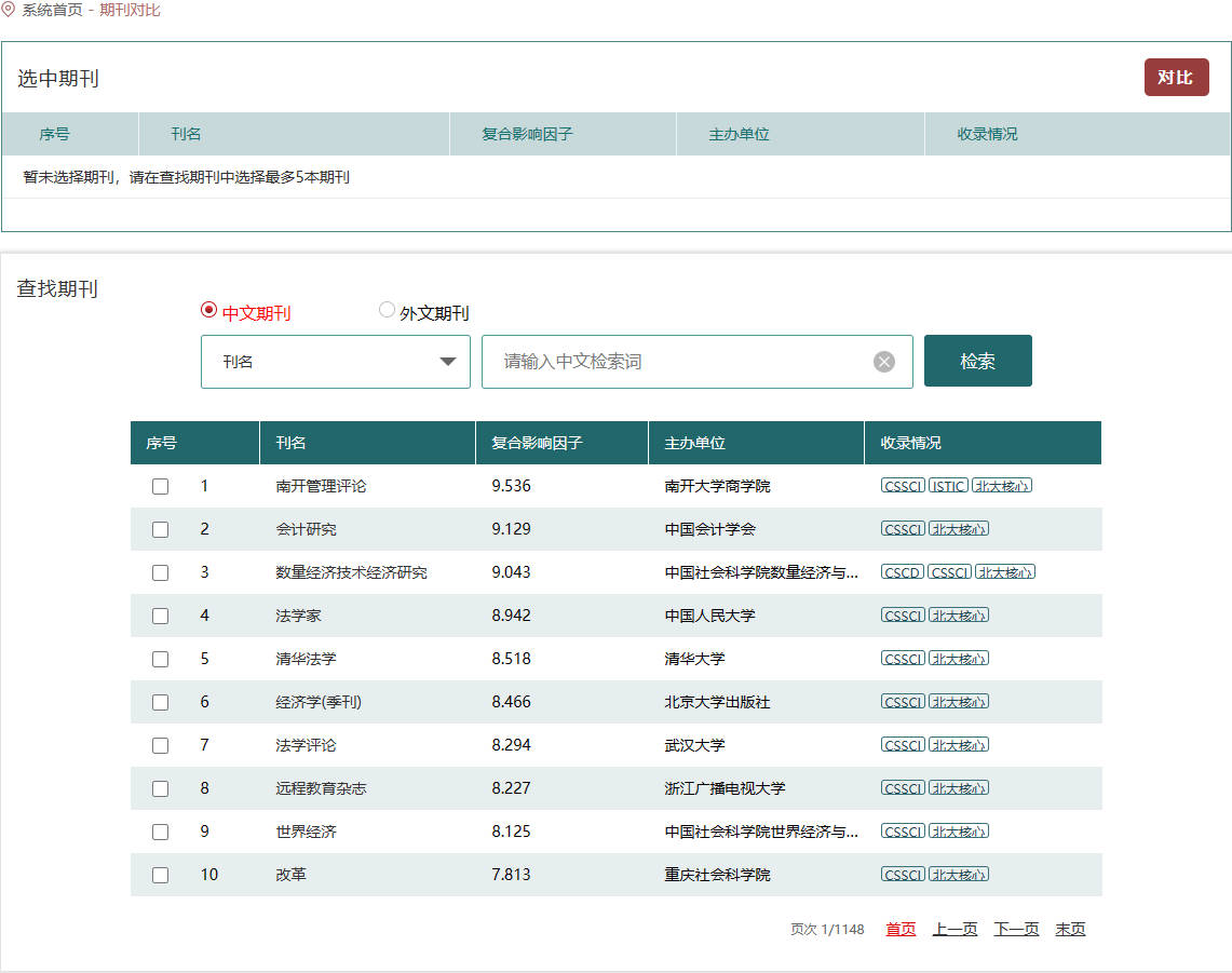 最多可选择5本期刊进行对比,用户检索期刊后,勾选加入对比,选好期刊后,点击 对比,进入到期刊对比结果页面。