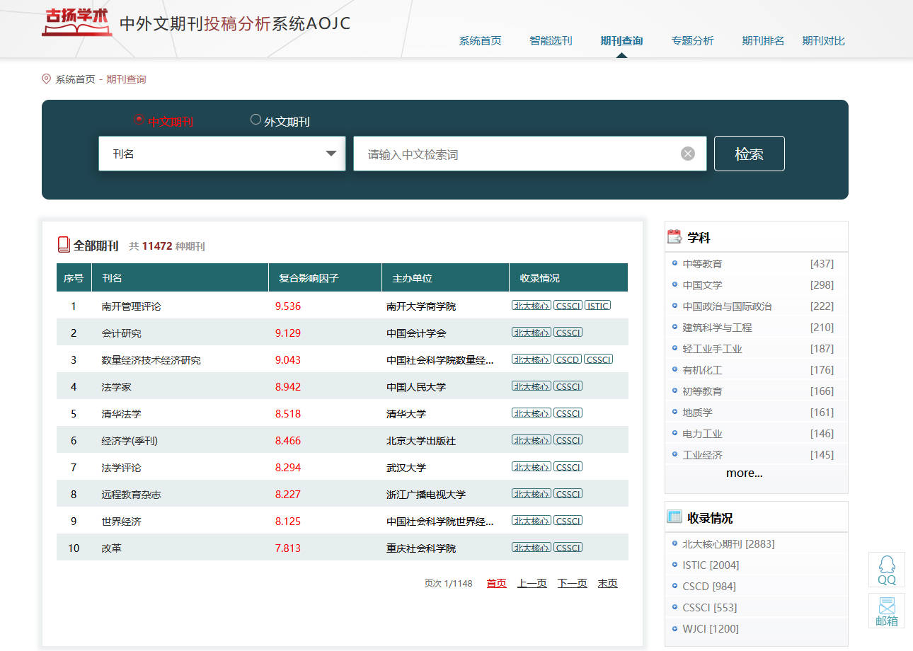 期刊查询的搜索条件有 刊名,CNNo号,ISSN号,主办单位/出版者,并通过 学科 和 收录情况 聚类,使查询目标更明朗精确,结果更精确。