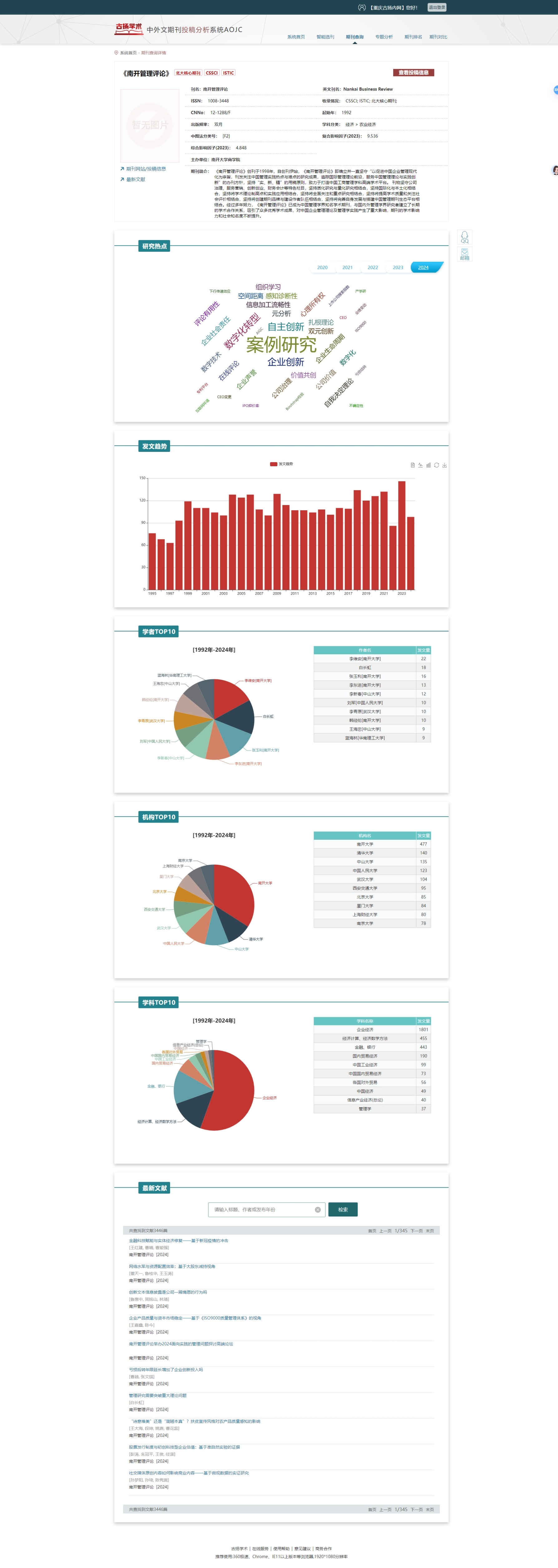 分析报告分多个板块,显示期刊的基本信息、研究热点、发文趋势、发文学者Top10、发文机构Top10、学科分布Top10等;